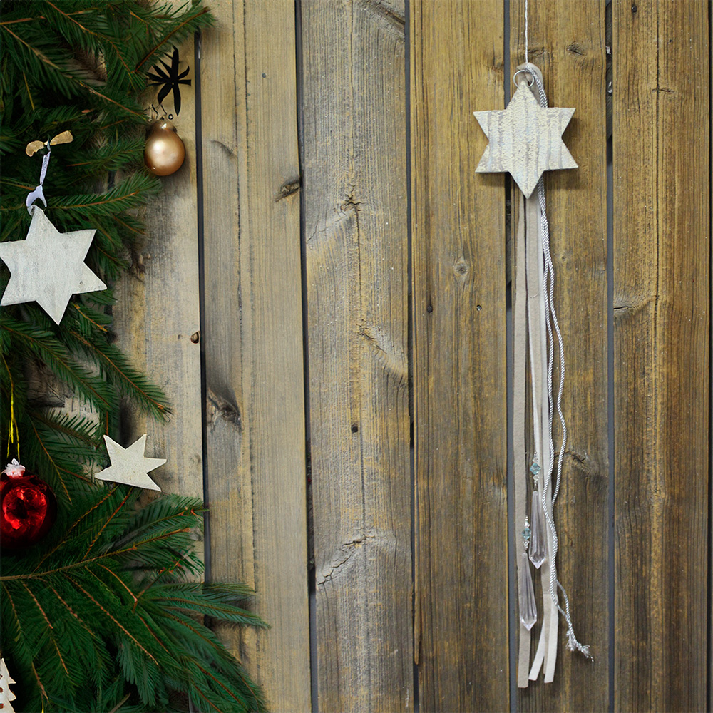 Rustiikkisesta paperimassatähdestä roikkuu koristeena huopanauhoja, hopeanyöriä, akryylihelmiä ja -kristalleja. Tähdessä on metallinvärinen ripustusketju.