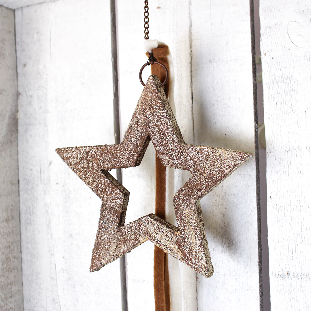 Rustiikkisesta paperimassatähdestä roikkuu koristeena huopanauhoja ja sen voi ripustaa ruosteensävyisellä ketjulla.