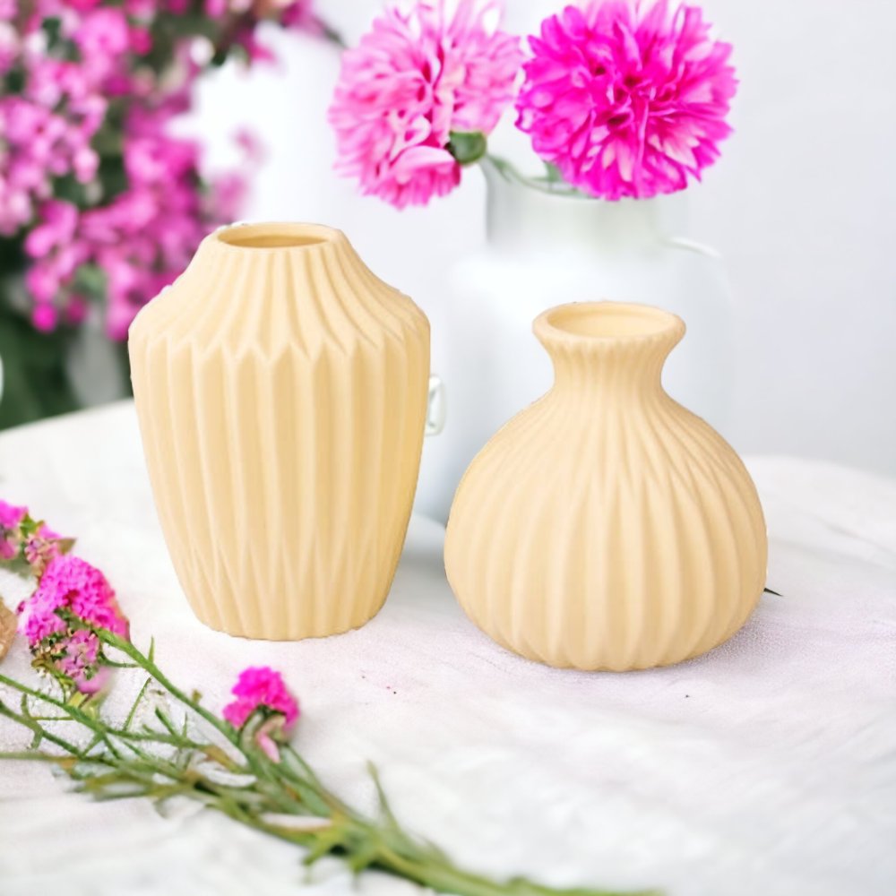 Vaaleankeltainen hempeä keraaminen kukkamaljakko, jonka korkeus on 12 cm. Pintaa koristaa kaunis vekkimäinen muotoilu.