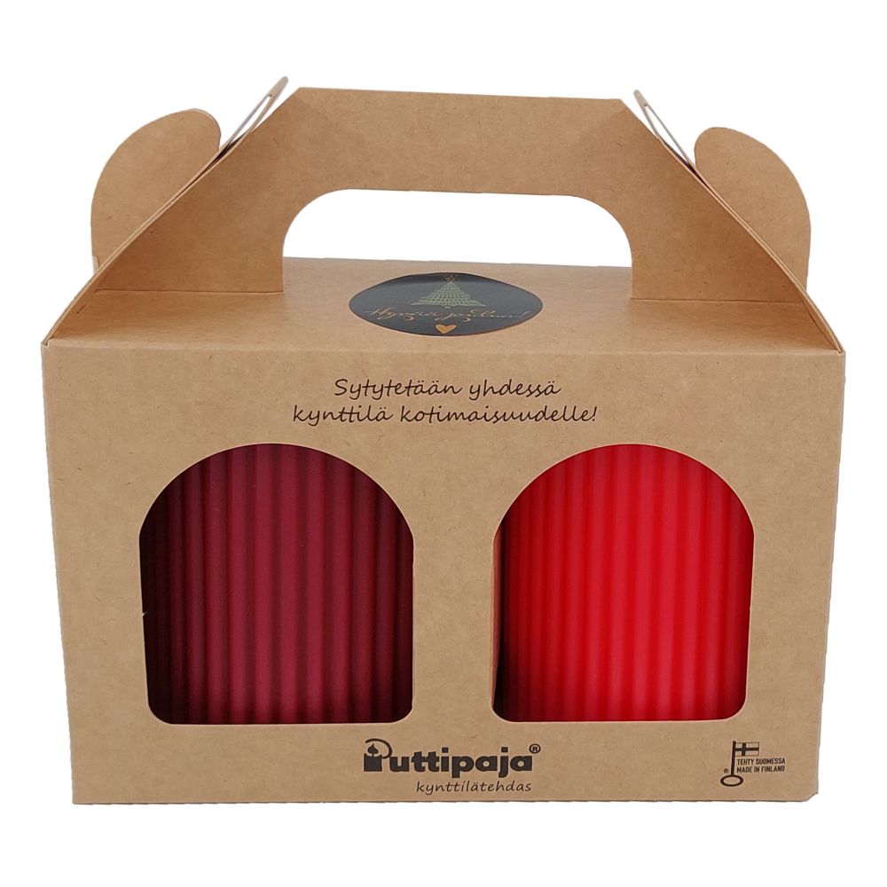 Viinin värinen ja punainen vekkikynttilä lahjapaketissa.