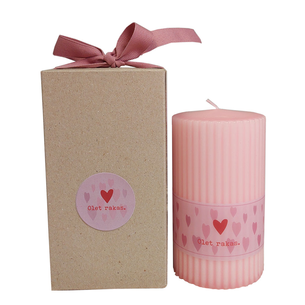Kynttilä on kääräisty silkkipaperiin ja paketoitu kartonkipakkaukseen. Tekstiilinauha viimeistelee ihanan yllätyksen.