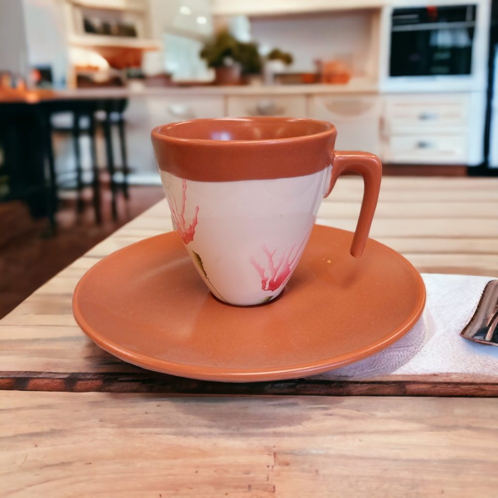 Herkkä kukkakuvioinen kahvikuppi ja asetti.