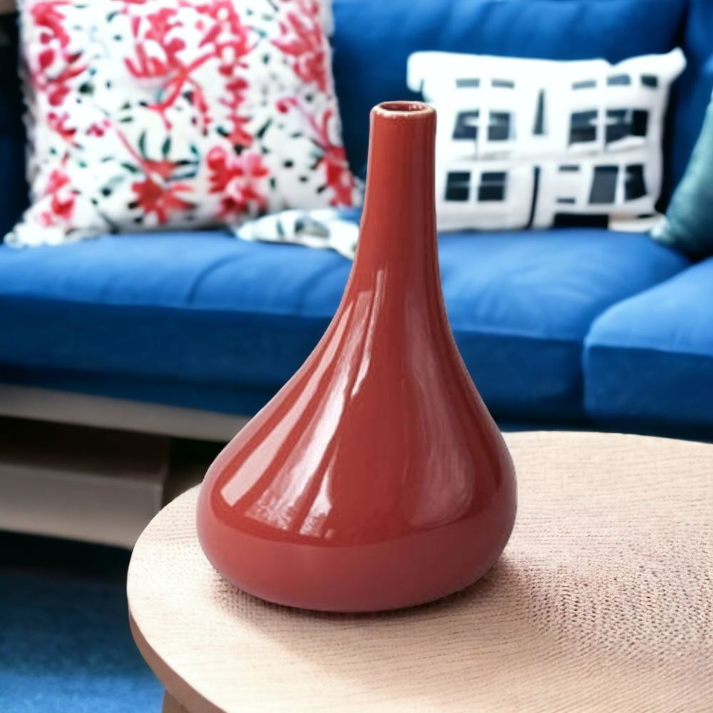 Terracotan sävyinen maljakko tyylikkäisiin kukka-asetelmiin.