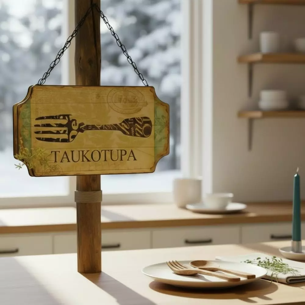 Metallinen kyltti ripustuslenkillä, kyltissä lukee "Taukotupa"