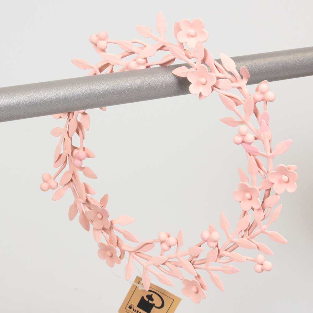 Roosan värinen metallinen kynttilämansetti tai kukkakranssi.