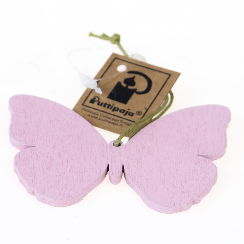 Puinen perhonen. Värit roosa Korkeus: 5,5cm. Leveys: 7cm Paksuus: 2mm Nauhan pituus: 8,5cm