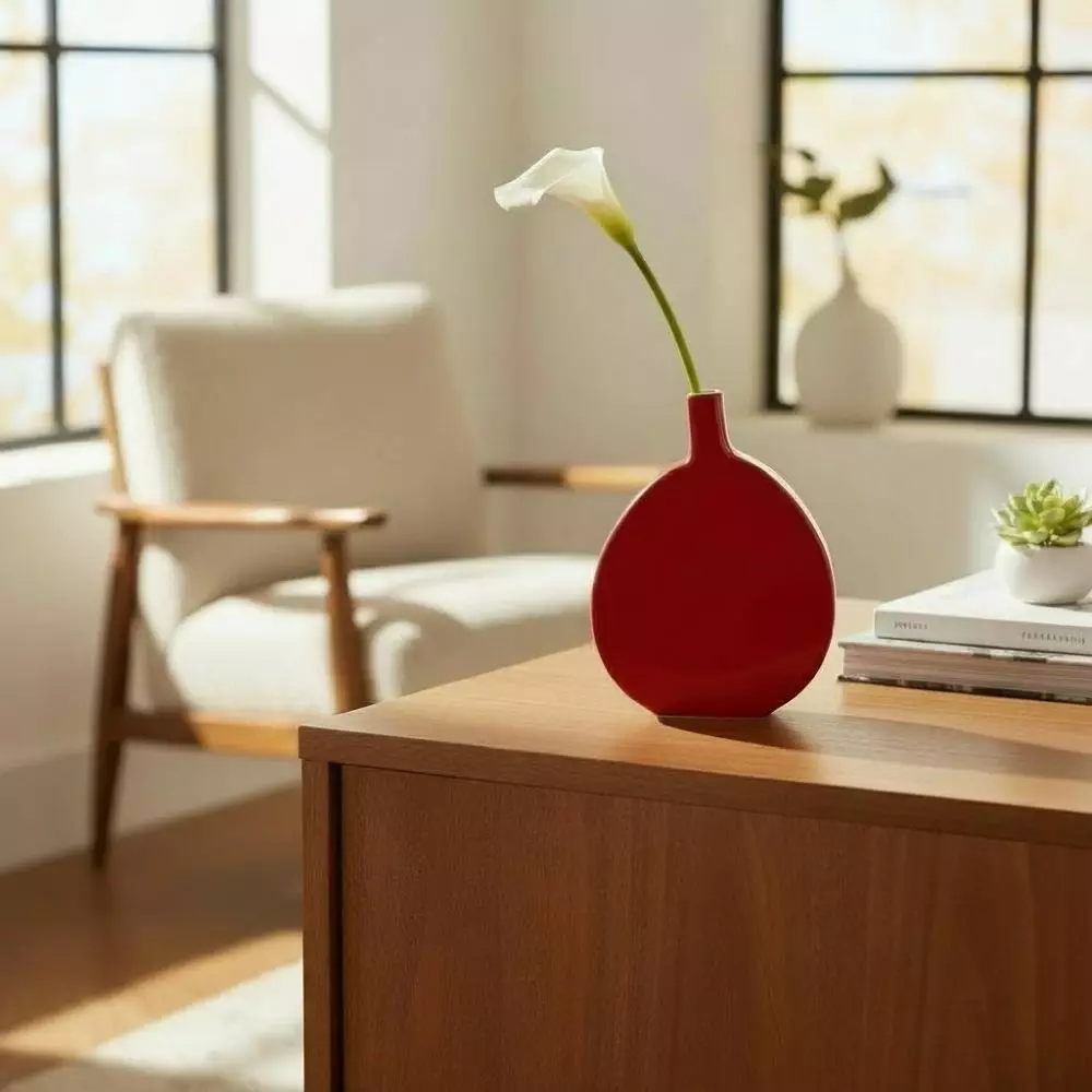 Punainen litteä keraaminen maljakko. Vaasissa on pienehkö suuaukko yhdelle kukalle.