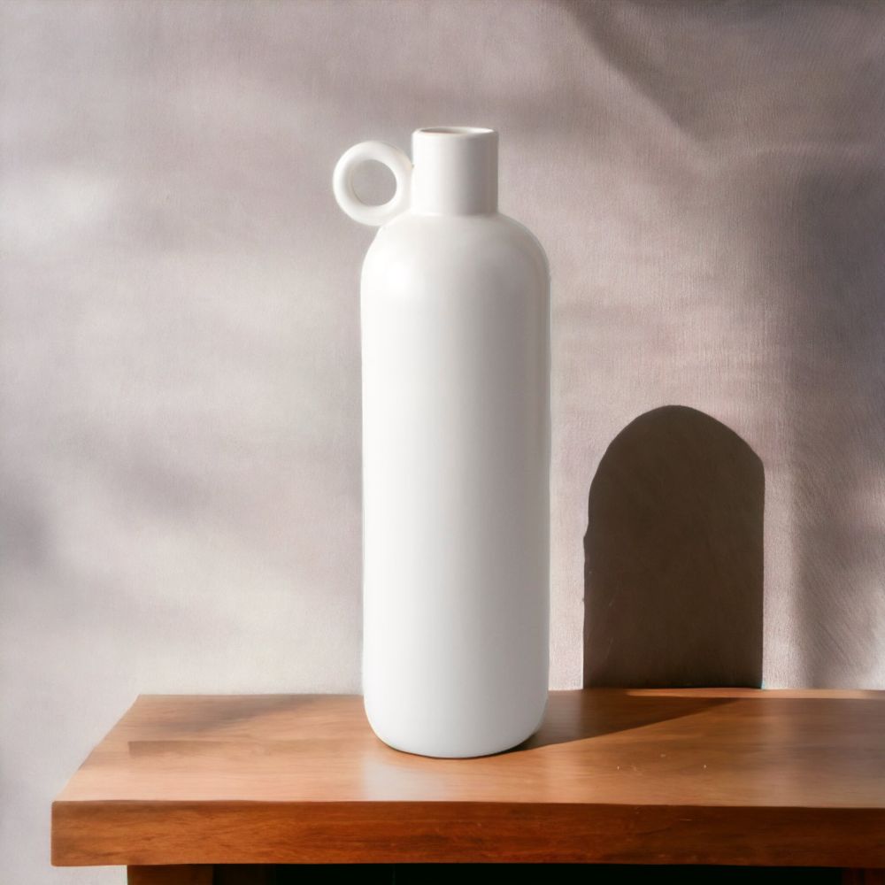 Keraaminen valkoinen pullomaljakko ihastuttaa yksinkertaisella muotoilullaan. Tätä voi käyttää myös karahvina kattauksessa.